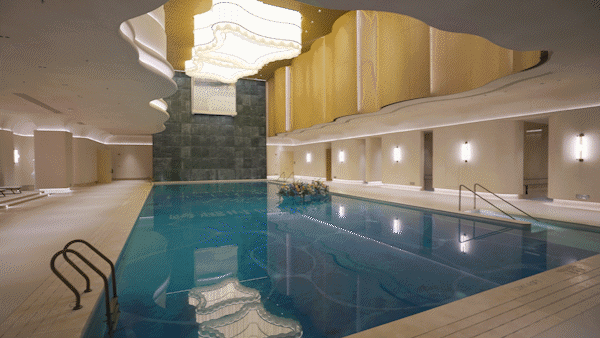 项目标志性的“蝴蝶振翅”造型,不仅定格在立面上,更贯穿整个泳池空间:约10米挑高的泳池本身已足够震撼,项目更以“云状”灯体✿★、层叠天花板块搭配大量曲线墙面,构建极具视觉冲击力的空间质感.